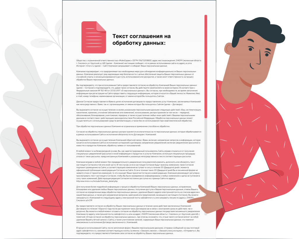 В процессе использования Сайта, после заполнения форм с Вашими персональными данными, отправки сообщений на наш почтовый адрес sales@mnsrv.ru, нажимая соответствующую кнопку (а именно: «Заказать звонок», «Заказать консультацию», «Отправить»), Вы подтверждаете, что предоставляете Компании свое согласие на обработку Ваших персональных данных.